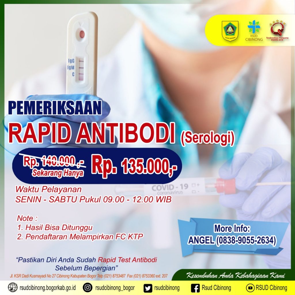 Pelayanan rapid test antibodi di RSUD Cibinong dibuka setiap hari Senin – Sabtu Pukul 09.00 – 12.00 WIB. Aapun tarifnya adalah sebagai berikut :
