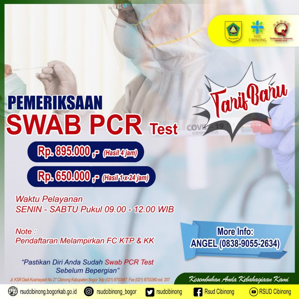 PelayananSWAB PCR di RSUD Cibinong dibuka setiap hari Senin – Sabtu pada pukul 09.00 – 12.00 WIB. Berikut tarif baru pelayanan Swab PCR COVID-19 di RSUD Cibinong.