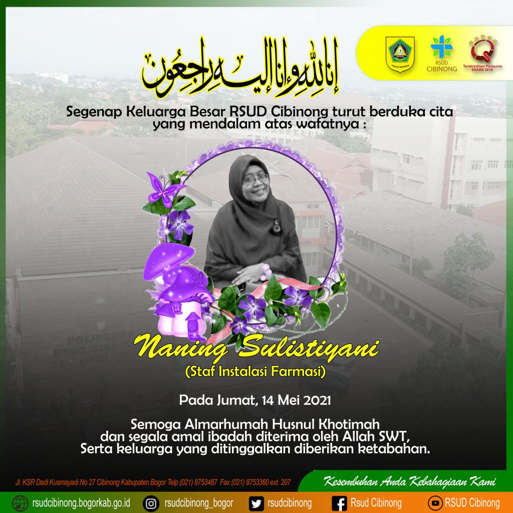 Innalillahi wa inna ilaihi roji’uun “Sesungguhnya kami adalah milik Allah dan kepada-Nya lah kami kembali”. Telah berpulang ke Rahmatullah, Ibu Naning Sulistiyani (Staf Instalasi Farmasi). Pada hari Jumat 14 Mei 2021 di RSUP Fatmawati.