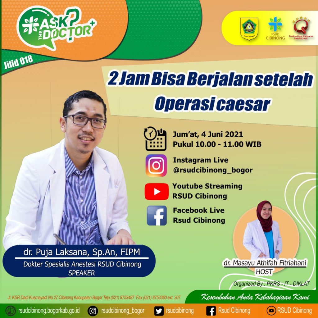 Simak informasi lengkapnya dalam program Ask The Doctro (ATD) jilid 18 dengan Narasumber dr.Puja Laksana, Sp.An, FIPM dan akan dipandu oleh Host kita dr. Masayu Athifah Fitriahani pada Jumat 04 Juni 2021 Pukul 10.00 – 11.00 WIB yang disiarkan langsung melalui akun social media RSUD Cibinong.