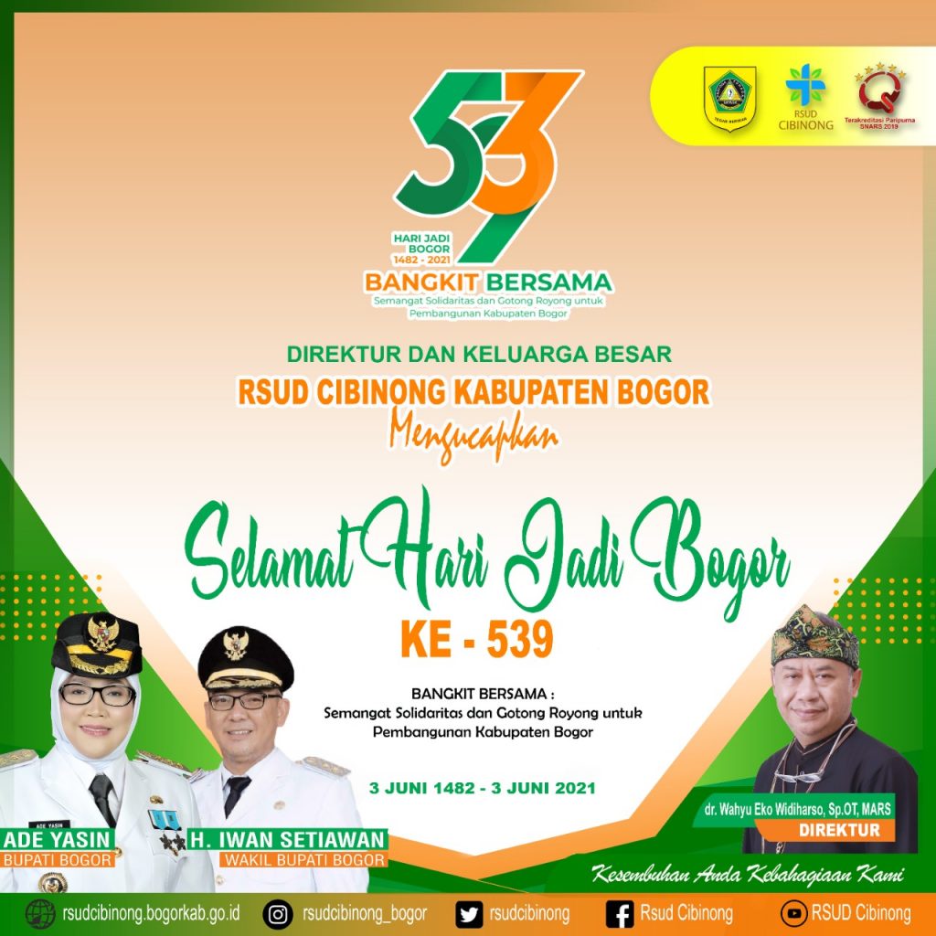 Direktur dan Keluarga Besar RSUD Cibinong mengucapkan “Selamat Hari Jadi Bogor ke-539” Tepat 3 Juni 2021 hari ini, Bogor memasuki usia ke lima ratus tiga puluh sembilan (539) tahun.
