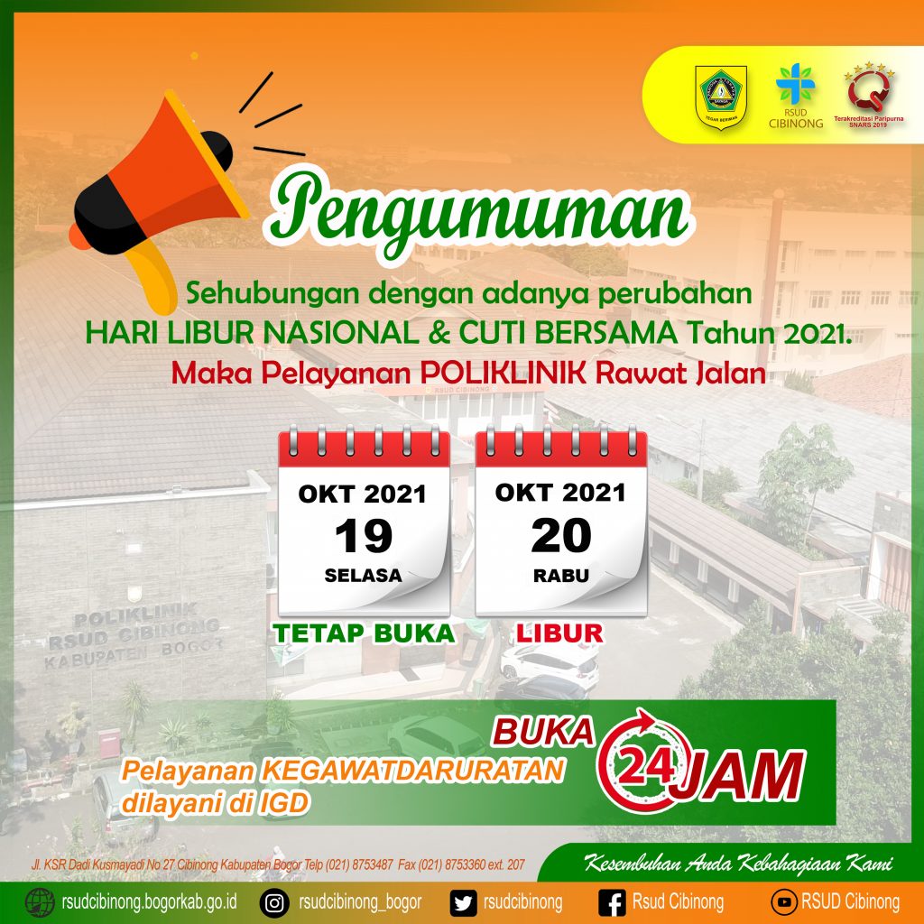 Sehubungan dengan adanya perubahan HARI LIBUR NASIONAL & CUTI BERSAMA Tahun 2021. Maka pelayanan POLIKLINIK Rawat Jalan :