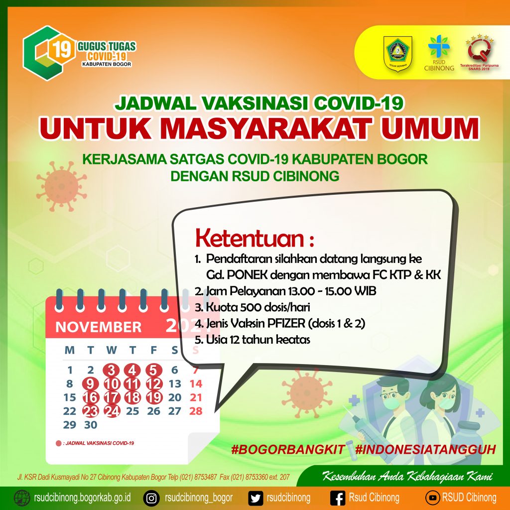 RSUD Cibinong bekerjasama dengan SATGAS COVID-19 Kabupaten Bogor kembali membuka layanan vakasinasi COVID-19 untuk masyarakat umum. Bagi Healties yang ingin mendaftar silahkan datang langsung ke Gd.PONEK dengan membawa FC KTP dan KK.
