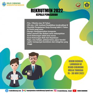Hai healthies, Ayo bergabung dengan RSUD Cibinong!✨ Rekrutmen 2022Kepala Pemasaran Kualifikasi :– Pria/wanita max usia 30 tahun– IPK minimal 3,00 Institusi Pendidikan Terakreditasi B– Memiliki…